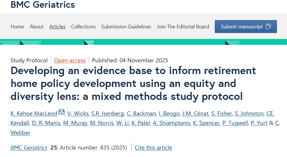 Look for our new protocol paper published in BMC Geriatrics. We are looking at equity in retirement homes in Ontario.