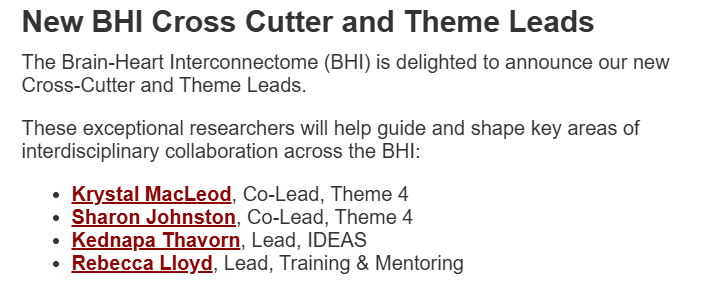 I am delighted to contribute to the leadership of Theme 4: Innovative Health Systems and Tailored Models of Care of the Brain-Heart Interconnectome in collaboration with co-leads Dr. Sharon Johnston and Dr. Malcolm King.